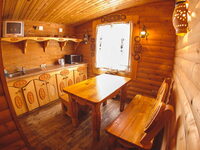 Двухэтажный коттедж на 8 человек в стиле русской хохломской росписи. Четыре комнаты на 2 человека в каждой, душевая кабина. Посуда, микроволновая печь, холодильник, телевизор, гриль-печь. Рядом веранда с возможностью барбекю.