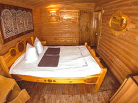 Стилизованный коттедж в морской тематике на 4-6 человек. Две спальни, интерьер в стиле парусного судоходства — кровать со спинкой-штурвалом, резная мебель, подвесной стол на канатах. Туалет, душ, столовая, кухня с посудой, холодильник, СВЧ-печь, телевизор, гриль-печь, веранда.