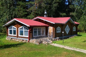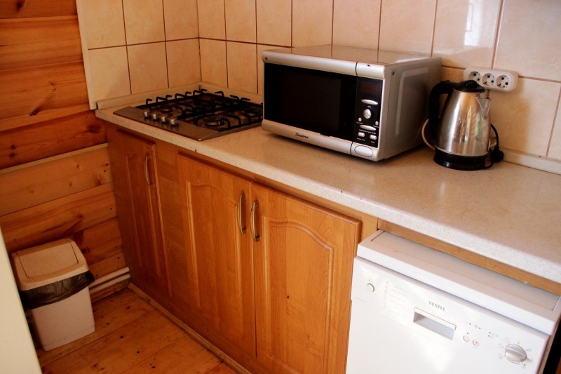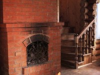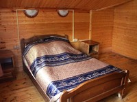 На первом этаже столовая с камином, который согревает в зимнюю стужу и создает необходимый уют прохладным летним вечером, спальня с двухместной кроватью, ванная комната с современной сантехникой и небольшая, но очень удобная кухня с русской печкой, оснащенная, помимо того, электрическим чайником, холодильником, микроволновой печью и электрической плиткой. На втором этаже-спальная комната с камином, двухместной кроватью, туалетным столиком с зеркалом и вместительным шкафом. Рядом с домом баня с удобным холлом с камином, утепленным санузлом и бассейном (бассейн без подогрева, работает с мая по октябрь).